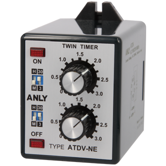 Prev Timer Analogue Timer ATDV TWIN ANALOGUE TIMER Add to inquiry Inquiry list Description Wiring and timing diagrams Overall dimensions or other Download Customized CMOS IC for low power consumption, high operation stability and extreme timing accuracy Independent adjustment for continuous ON-OFF operation and time 16 different time ranges available 2 operating voltage in a single unit, AC110V and 220V 5(A, B, C, D, E) timing series available* Each timing series has 4 time ranges, selectable via DIP switch* CE certified Note: "*" indicates applicable to ATDV multi range series only ATDV Catalogue